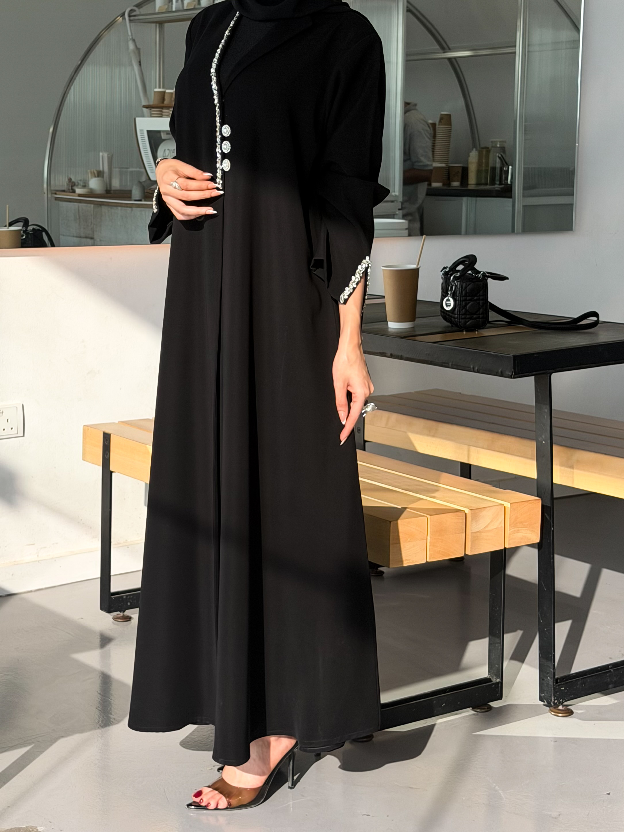 عباية مزينة بكرستال أبيض تصميم راقٍ بلمسة فخامة ناعمة، يمنحك إطلالة مميزة .