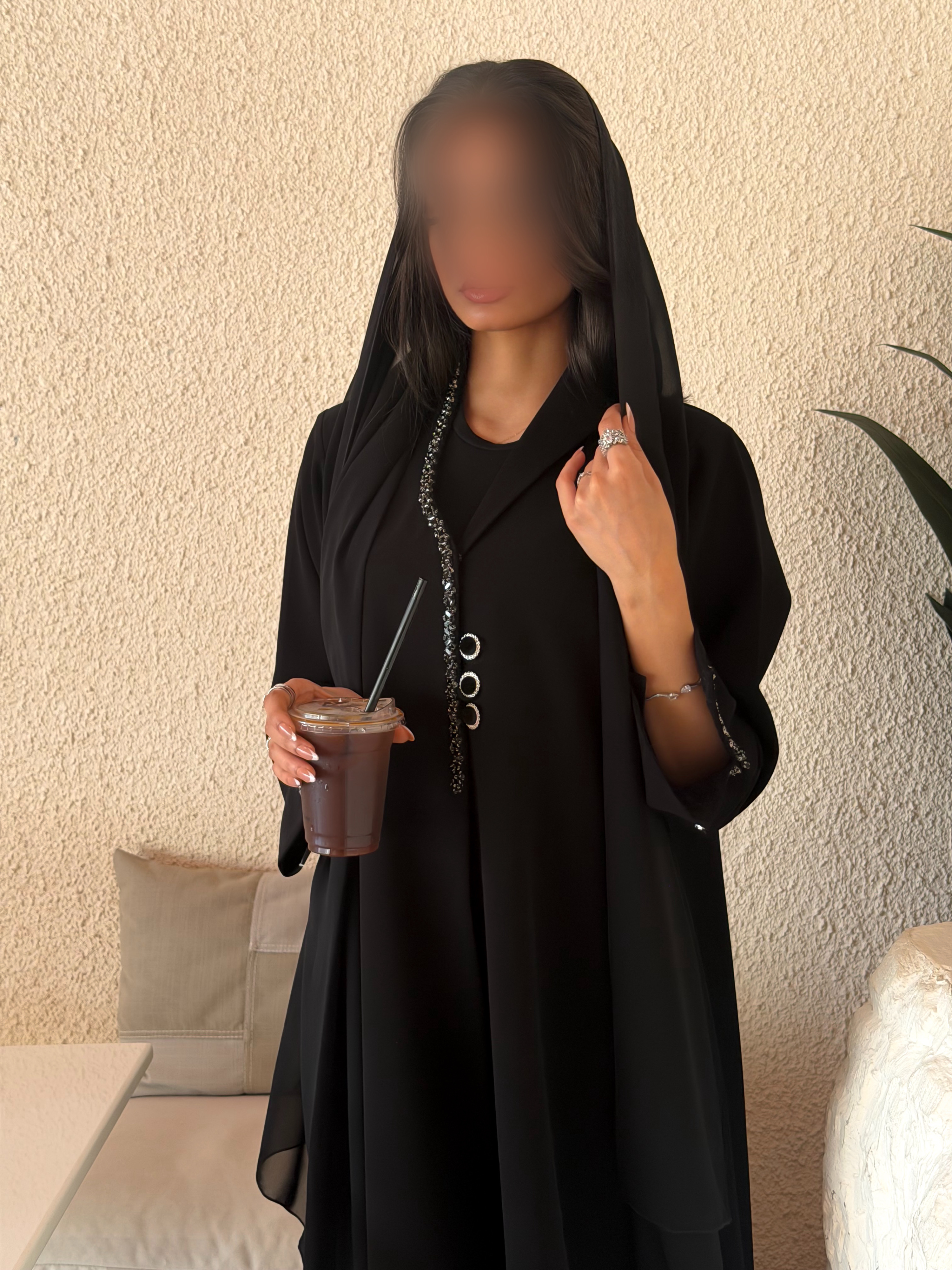 عباية مزينة بكرستال اسود لامع تصميم راقٍ بلمسة فخامة ناعمة، يمنحك إطلالة مميزة